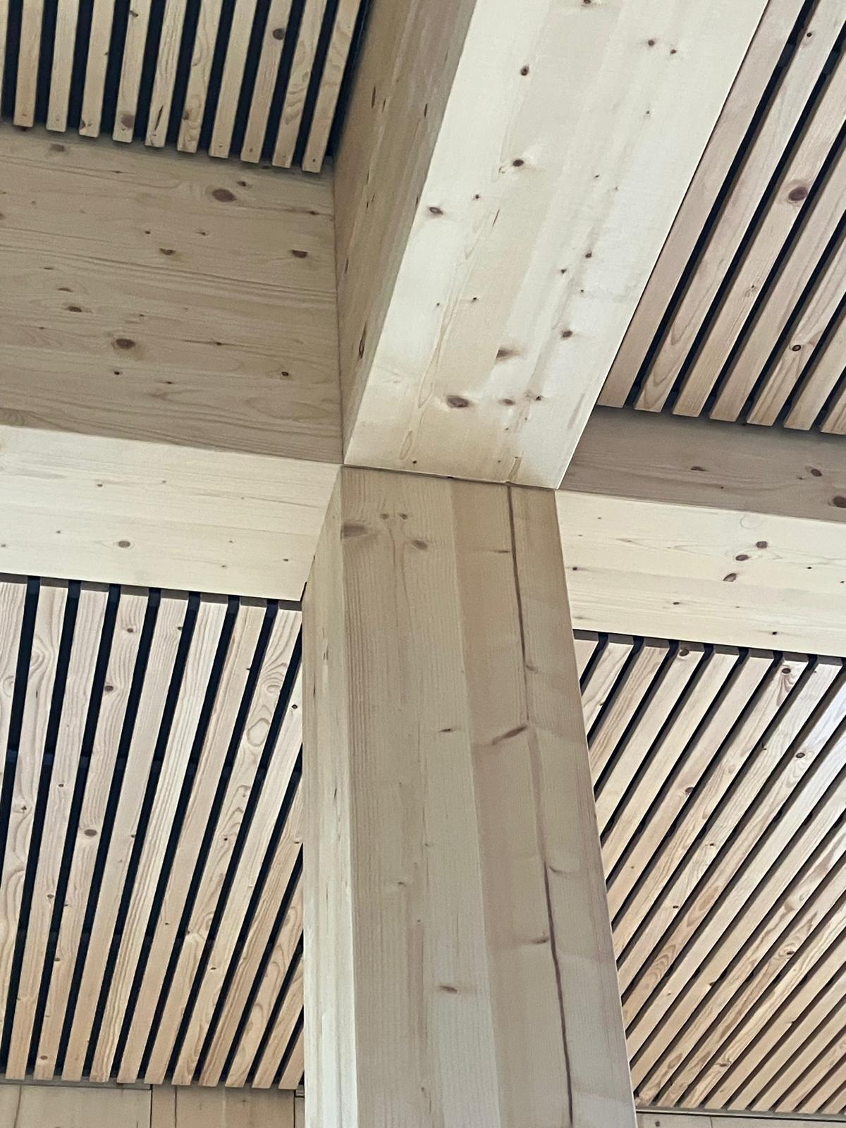 Zodra het gebouw dicht is en wordt verwarmd, daalt de luchtvochtigheid binnen. In een normaal binnenklimaat (ongeveer 21 °C en ±42% relatieve luchtvochtigheid) zien we vaak een houtvochtgehalte van rond de 8%.