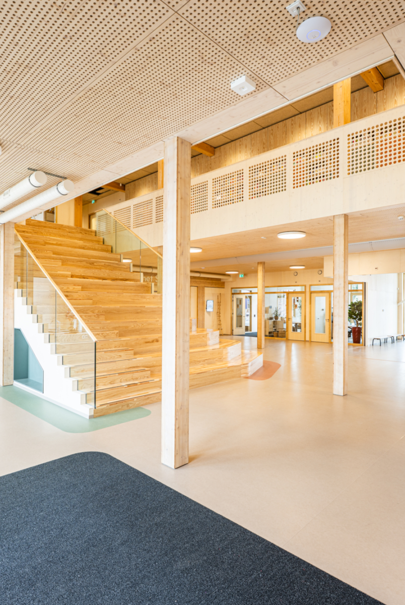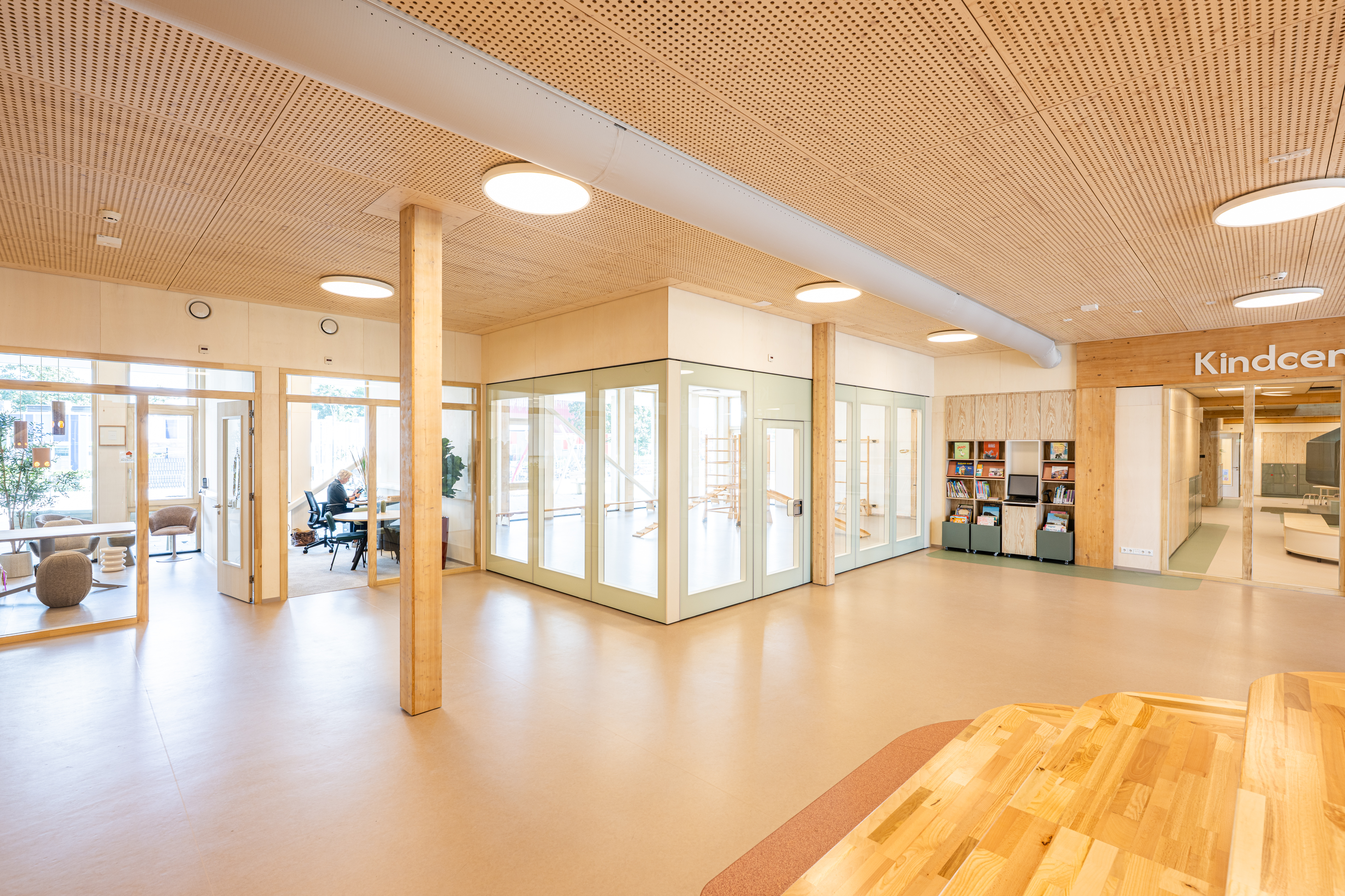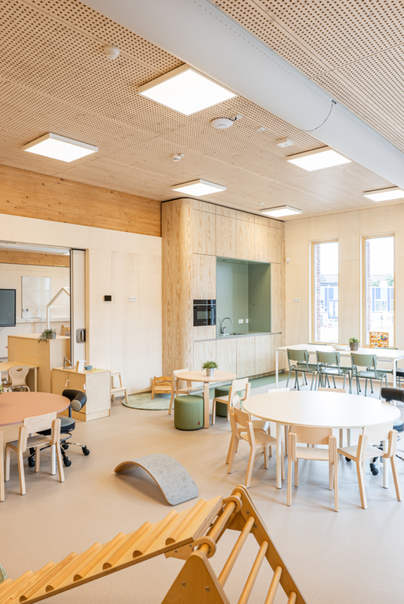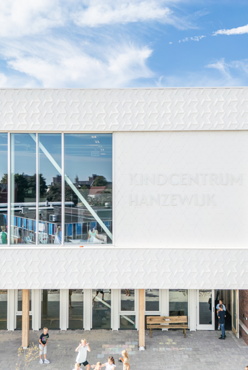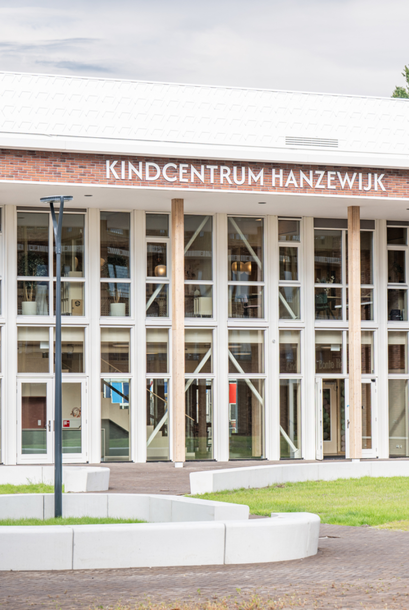 Kindcentrum Hanzewijk is een toonbeeld van toekomstbestendig bouwen. Het ontwerp maakt optimaal gebruik van hernieuwbare en hergebruikte materialen, waaronder de houtconstructie, maar ook de biocomposiet gevelaccenten en hergebruikte plafondplaten. De lichte, biobased constructies verlagen de milieu-impact en creëren tegelijkertijd een gezonde en warme omgeving.