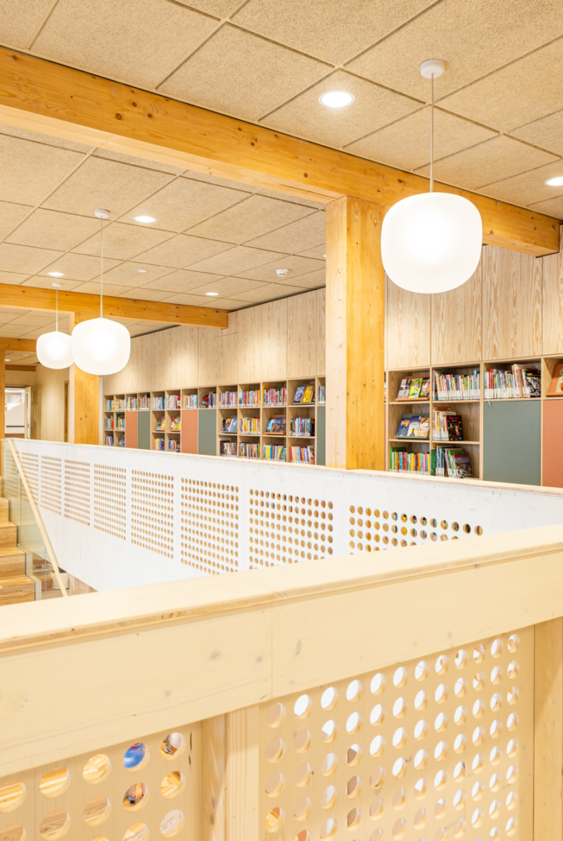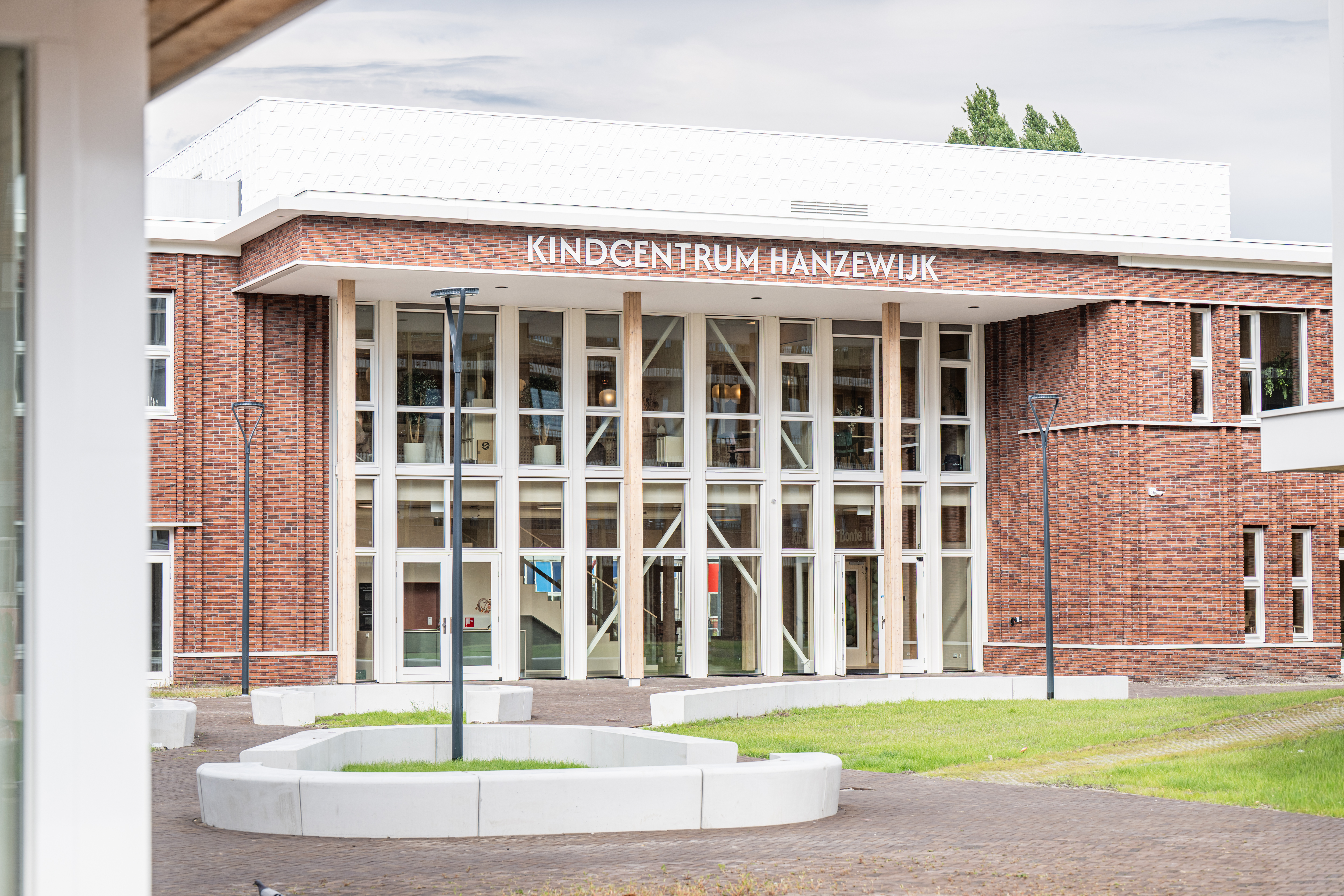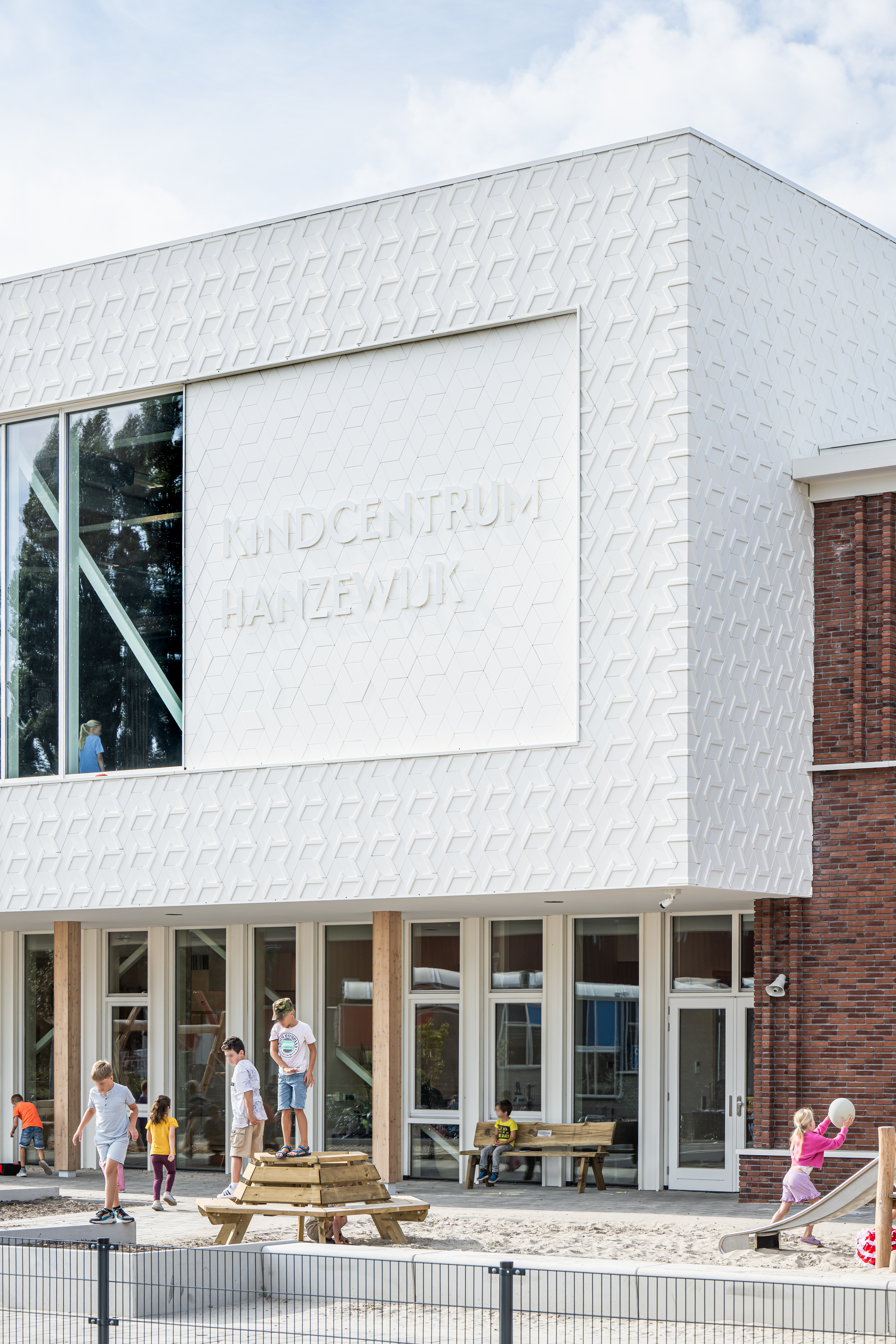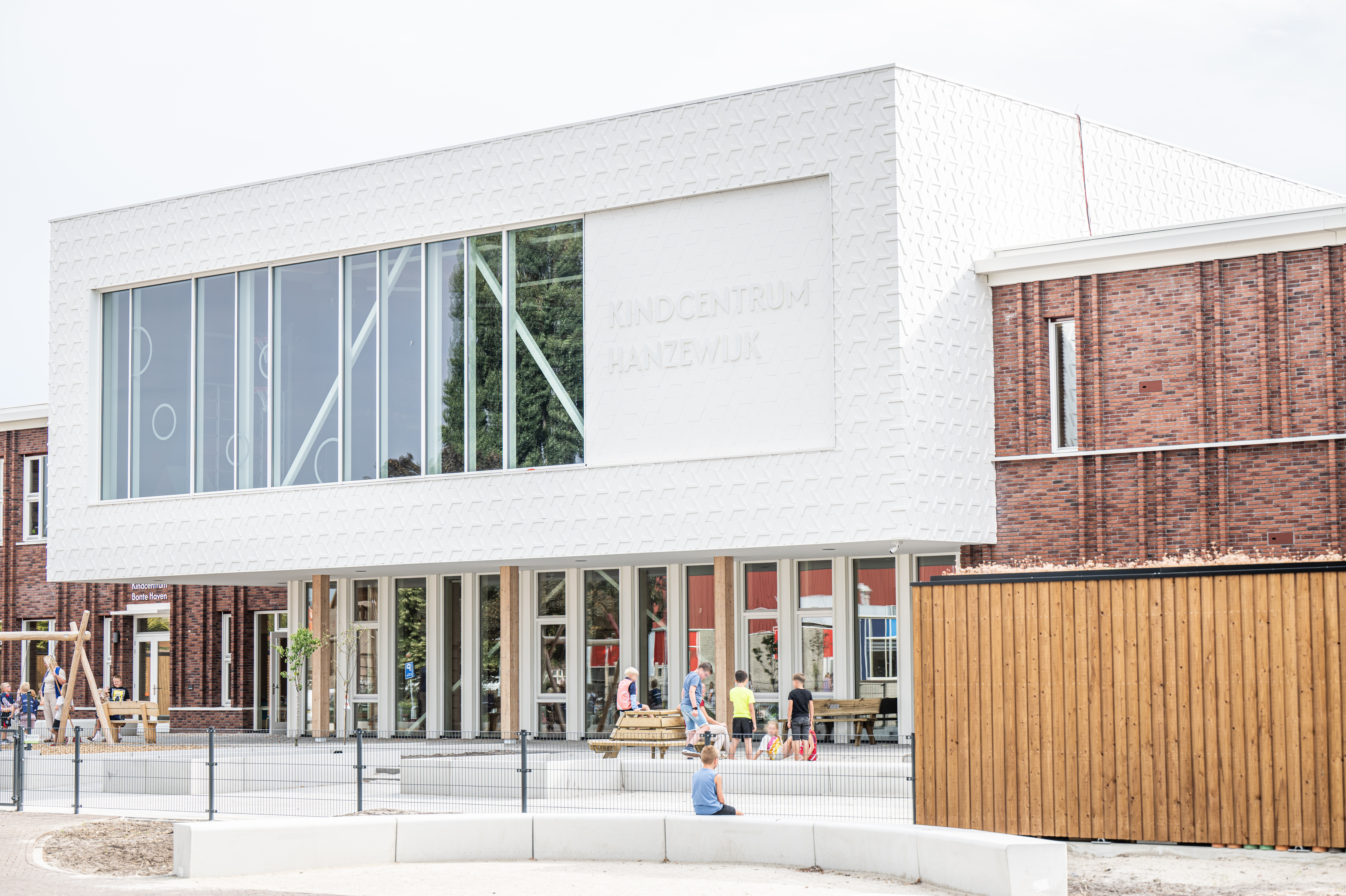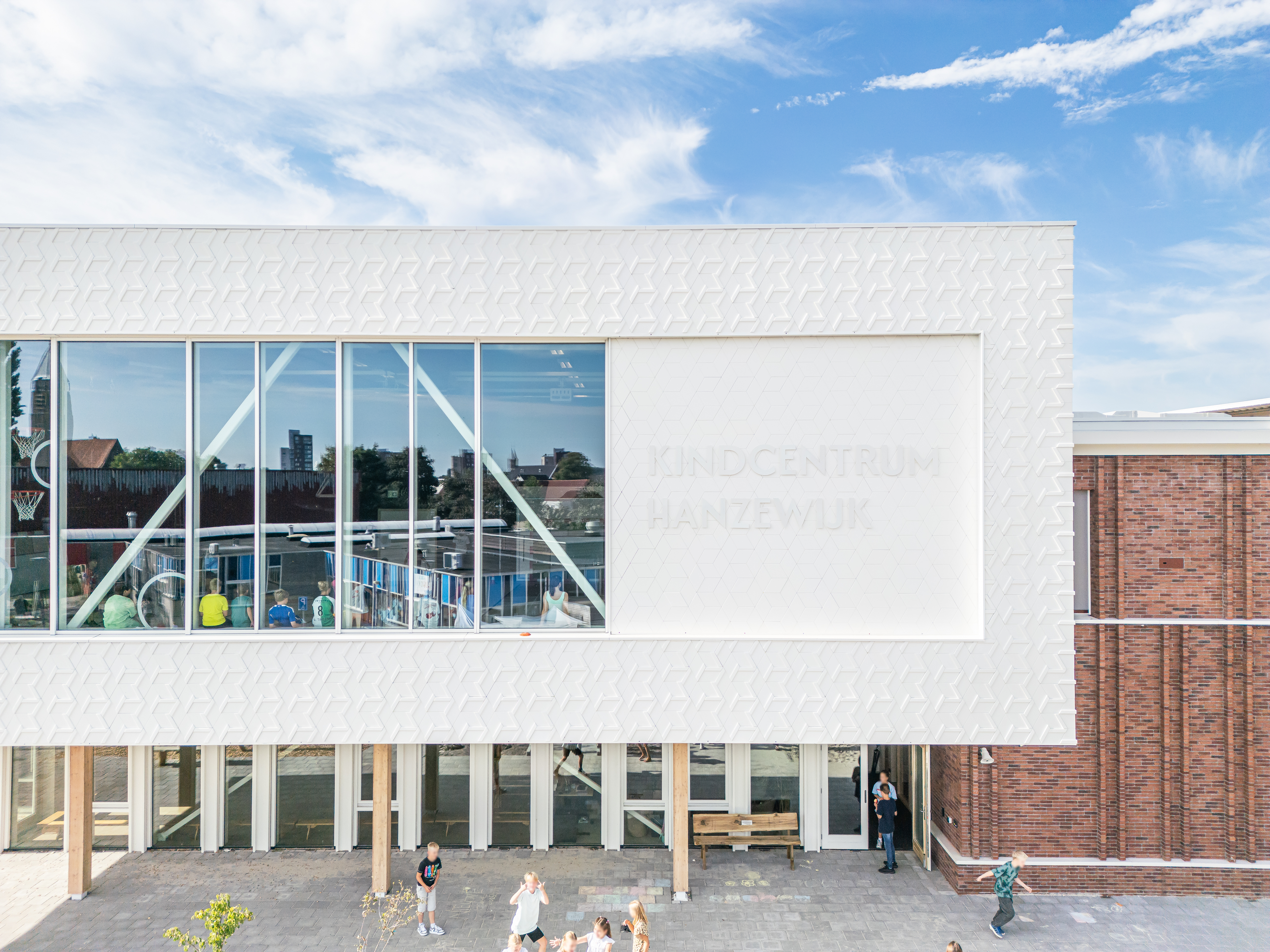 Kindcentrum Hanzewijk is een toonbeeld van toekomstbestendig bouwen. Het ontwerp maakt optimaal gebruik van hernieuwbare en hergebruikte materialen, waaronder de houtconstructie, maar ook de biocomposiet gevelaccenten en hergebruikte plafondplaten. De lichte, biobased constructies verlagen de milieu-impact en creëren tegelijkertijd een gezonde en warme omgeving.