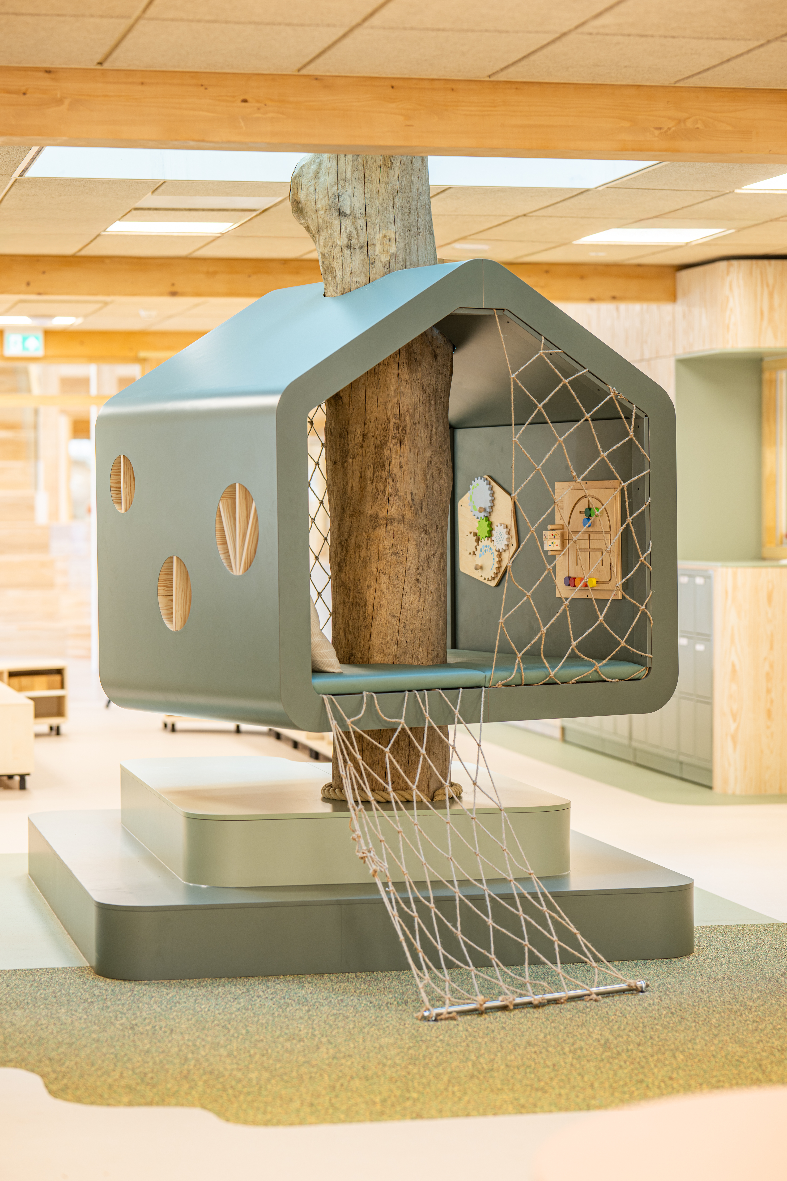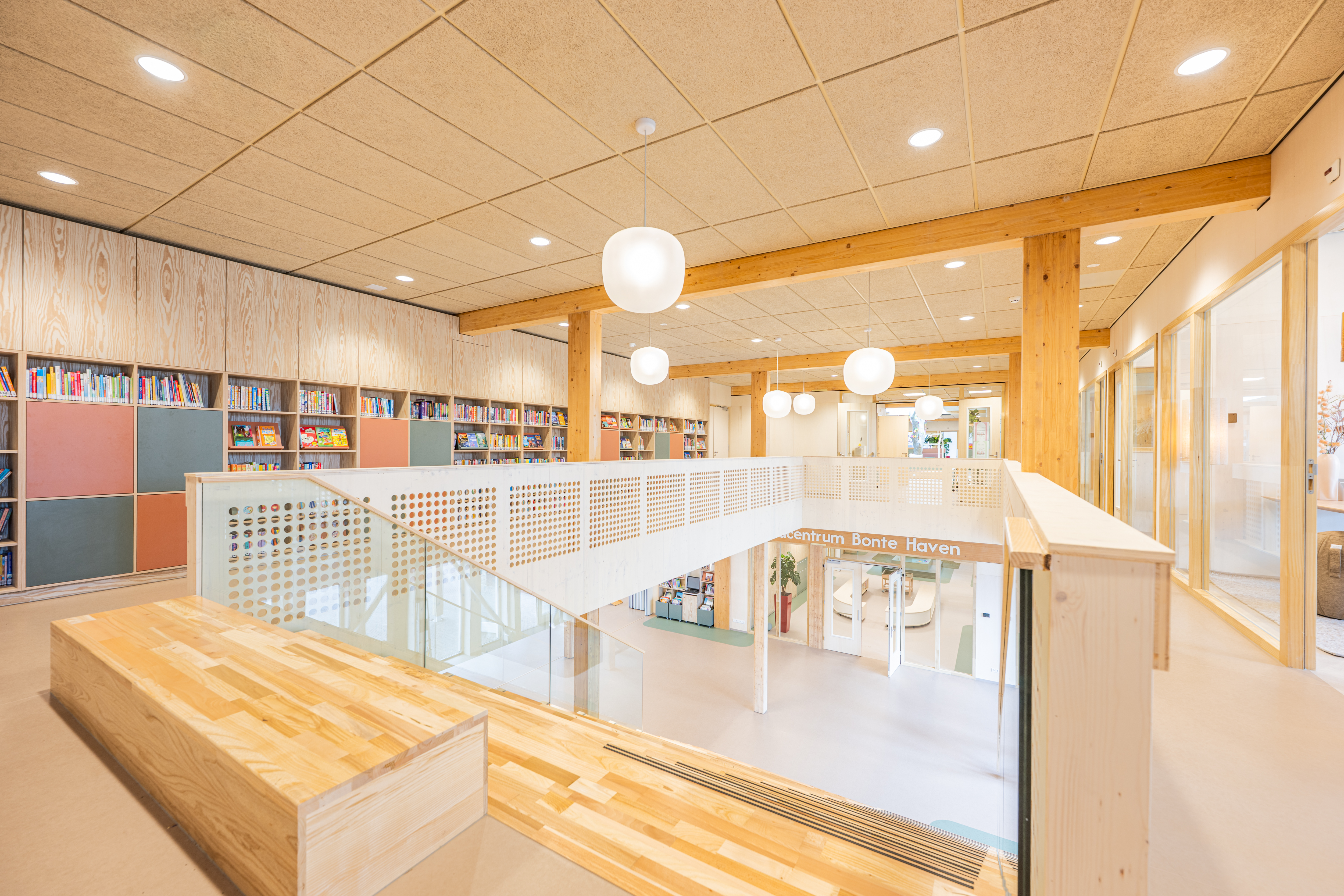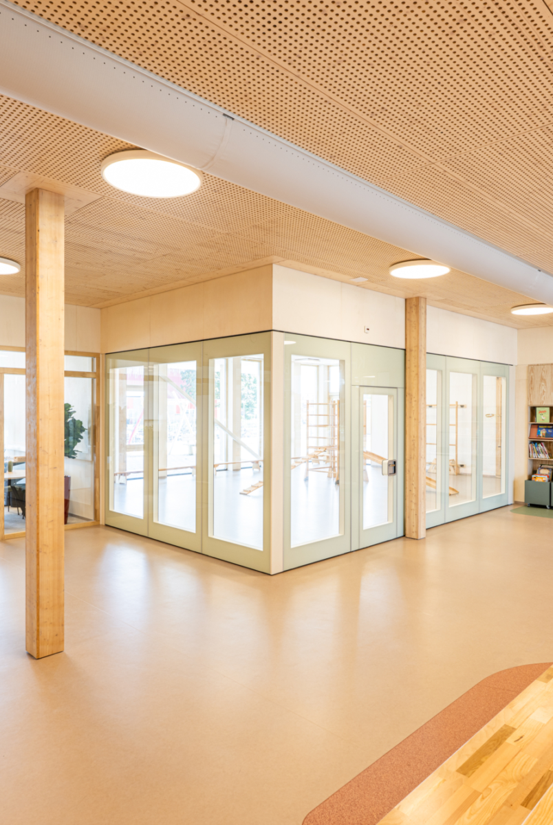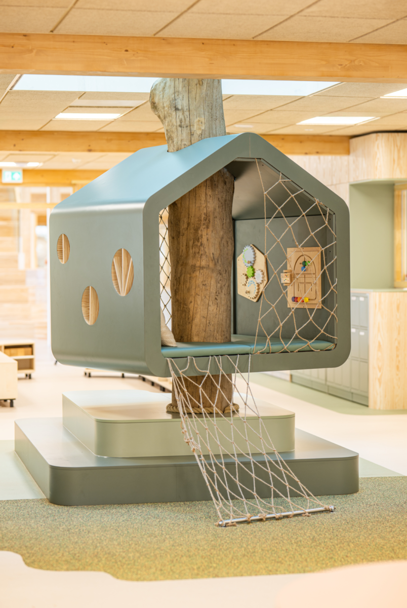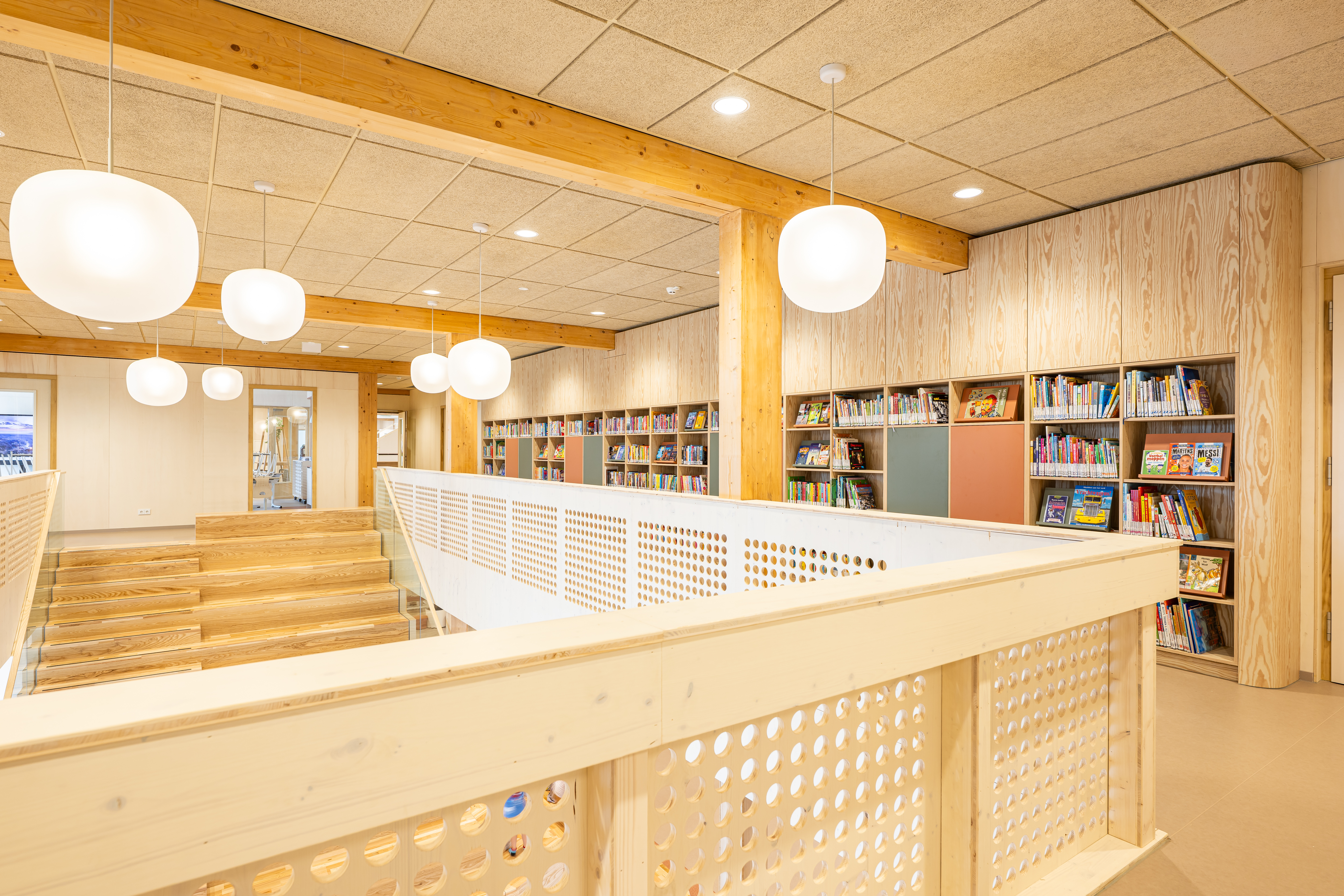 Kindcentrum Hanzewijk is een toonbeeld van toekomstbestendig bouwen. Het ontwerp maakt optimaal gebruik van hernieuwbare en hergebruikte materialen, waaronder de houtconstructie, maar ook de biocomposiet gevelaccenten en hergebruikte plafondplaten. De lichte, biobased constructies verlagen de milieu-impact en creëren tegelijkertijd een gezonde en warme omgeving.